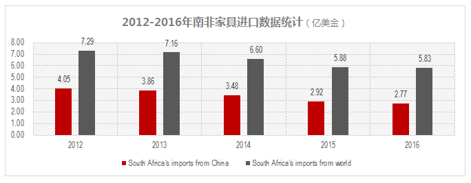 2016年南非家具總進(jìn)口額高達(dá)5.83億美元自中國進(jìn)口2.77億美元,占比47.51%。