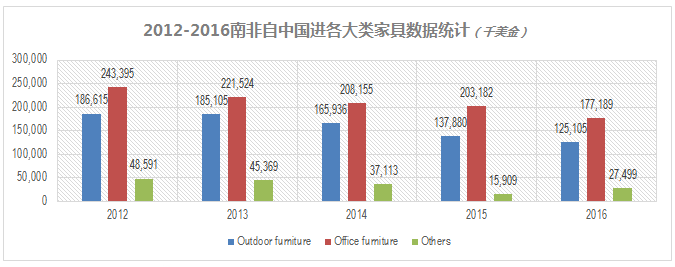 2016年南非自中國戶外家具金額高達(dá)1.25億美金,辦公家具進(jìn)口額為1.77億美金,其他家具及零部件274萬美金。