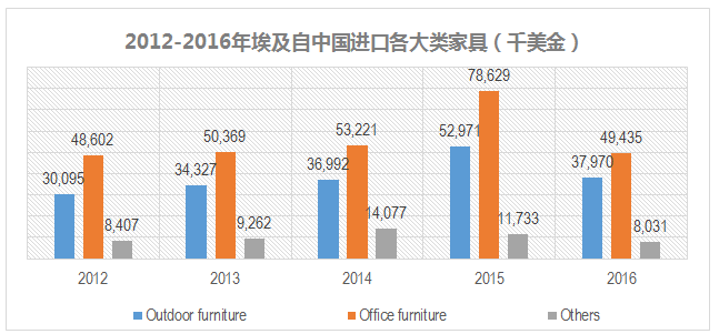 2016年埃及自中國戶外家具金額高達3797萬美金,辦公家具進口額為4943萬美金,其他家具及零部件803萬美金。