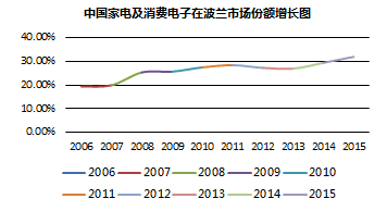 中國的家電及電子消費品在波蘭進口占比中逐年上升,2015年已達到進口的32.02%。