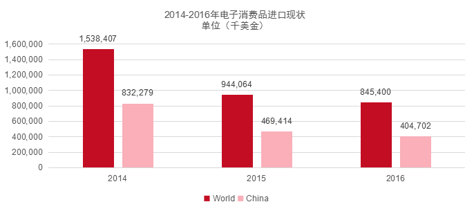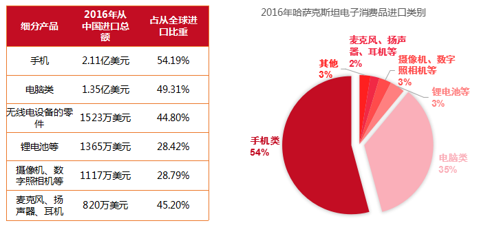 2016年哈薩克斯坦電子消費(fèi)品從世界進(jìn)口總額為8.46億美元,其中自中國進(jìn)口4.04億美元,占比47.84%。熱銷產(chǎn)品進(jìn)口量前三名的分別為手機(jī)類、電腦類、無線電設(shè)備零件等。