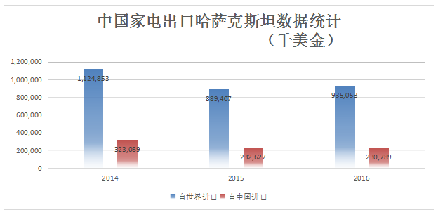 2016年哈薩克斯坦家用電器總進(jìn)口額為9.35億美元,其中自中國(guó)進(jìn)口2.3美元,占比24.7%。