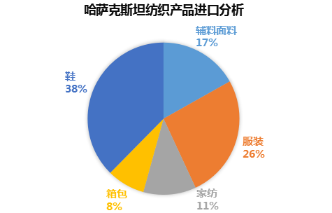 紡織類產(chǎn)品進(jìn)口量約 10億 美金,自中國進(jìn)口紡織品占比 32.1%。哈薩克斯坦進(jìn)口紡織品以 鞋、服裝 類居多。其次為 輔料面料、家紡、箱包。