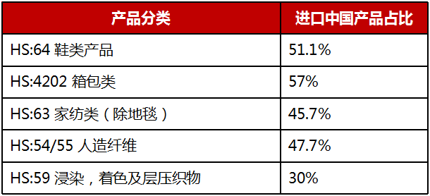 推薦產(chǎn)品:HS:64 鞋類產(chǎn)品; HS:4202 箱包類; HS:63 家紡類(除地毯); HS:54/55 人造纖維; HS:59 浸染,著色及層壓織物