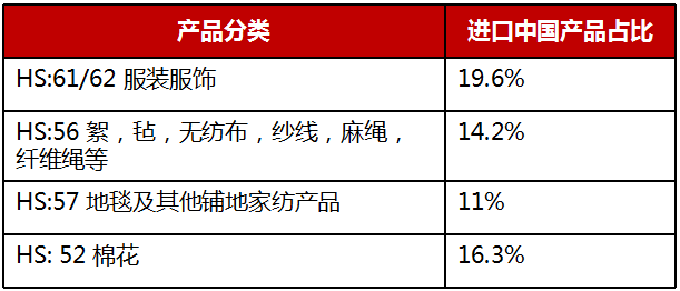 推薦產(chǎn)品:HS:61/62 服裝服飾;HS:56 絮,氈,無紡布,紗線,麻繩,纖維繩等;HS:57 地毯及其他鋪地家紡產(chǎn)品;HS: 52 棉花