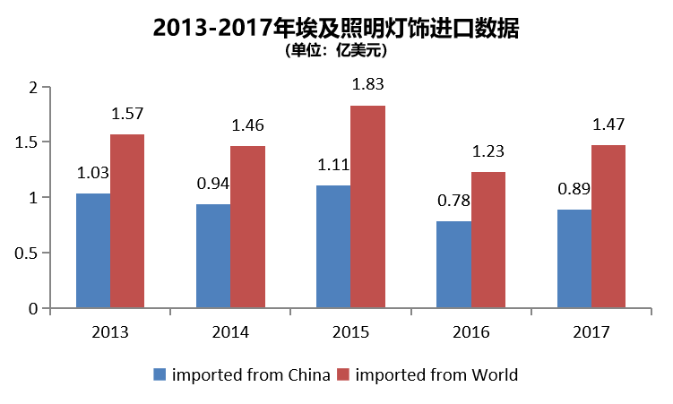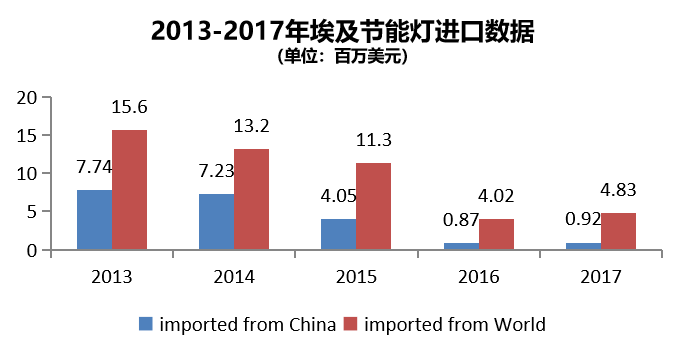 2017年埃及節(jié)能燈總進口483萬美元,從中國進口92萬美元,占比19.1%。