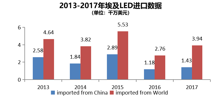2017年埃及LED燈總進口額3940萬美元,從中國進口1430萬美元,占比36.3%。