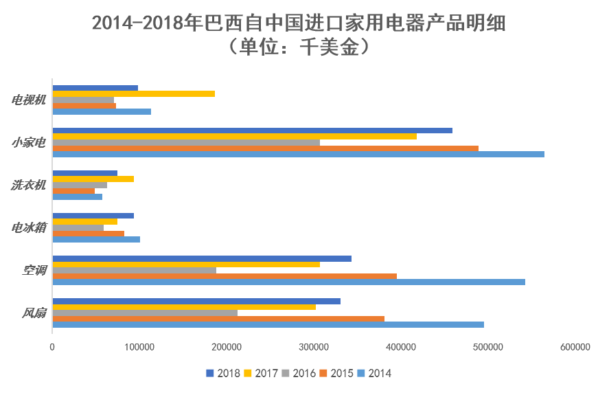 另外,巴西自中國(guó)進(jìn)口的小家電進(jìn)口額為4.59億美元,較2017年增長(zhǎng)9.15%(2017年小家電進(jìn)口額4.17億美元);隨著巴西經(jīng)濟(jì)的恢復(fù),各類產(chǎn)品進(jìn)口額逐漸上升