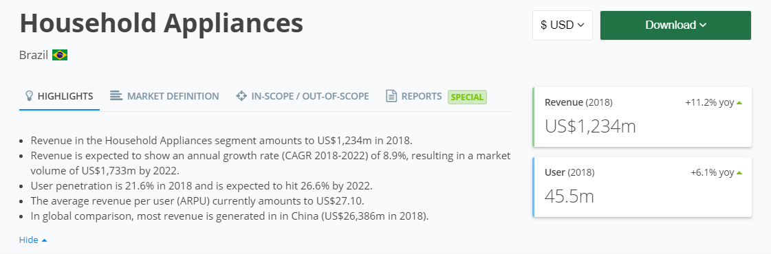 2018年家用電器部門的收入達(dá)到12.34億美元。預(yù)計(jì)收入將呈現(xiàn)8.9%的年增長(zhǎng)率(2018-2019年復(fù)合年增長(zhǎng)率),到2022年的市場(chǎng)交易量將達(dá)到17.33億美元。用戶滲透率在2018年為21.6%,預(yù)計(jì)到2022年將達(dá)到26.6%。