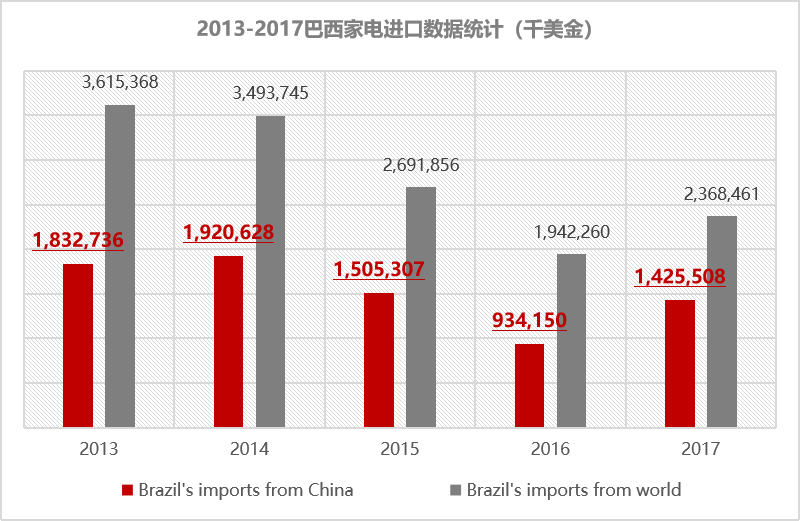 2017年巴西家用電器進(jìn)口量達(dá)23.68億美元。其中自中國(guó)進(jìn)口14.25億美元,同比增長(zhǎng)52.6%。中國(guó)家用電器出口占巴西進(jìn)口市場(chǎng)的60.2%。