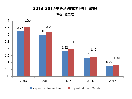 2017年巴西節(jié)能燈總進(jìn)口額8100萬美元,從中國進(jìn)口7700萬美元,占比95.1%。