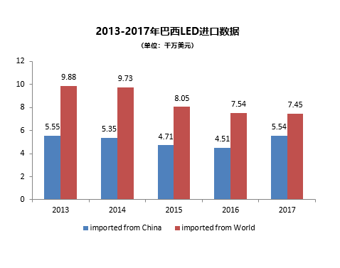 2017年巴西LED總進(jìn)口額7450萬美元,從中國進(jìn)口5540萬美元,占比74.4%。