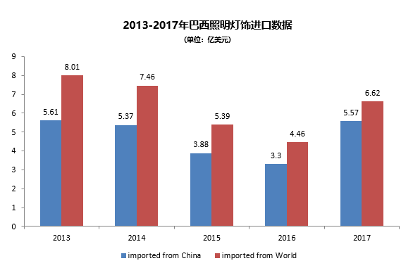 2017年巴西照明燈飾總進(jìn)口額6.62億美元,從中國進(jìn)口5.57億美元,占比84.1%。