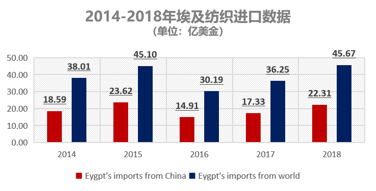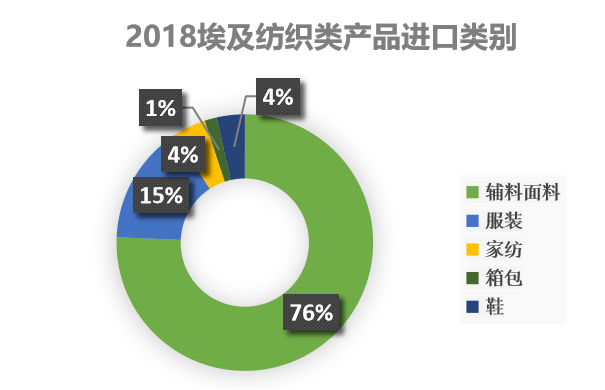 埃及70%的紗線面料和80%的輔料必須依靠進口,棉花等原料進口無關(guān)稅。2018年,埃及進口額為28.36 億美元,自中國進口13.34億美元,中國產(chǎn)品占比47.04%。