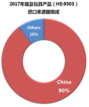 2017年埃及玩具產(chǎn)品進(jìn)口規(guī)模達(dá) 1929.1萬(wàn)美元,同比2016年增長(zhǎng) 16.2%;其中自中國(guó)進(jìn)口額為 1734.0萬(wàn)美元,同比2016年增長(zhǎng) 11.6%;埃及自中國(guó)進(jìn)口的玩具產(chǎn)品占比近 89.9% 。