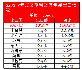 除了滿足國內(nèi)市場的塑料需求外, 埃及每年也出口大量的塑料制品至 非洲和中東其他國家,2017年的 出口額高達15.07億美元,主要出 口市場為土耳其和比利時。