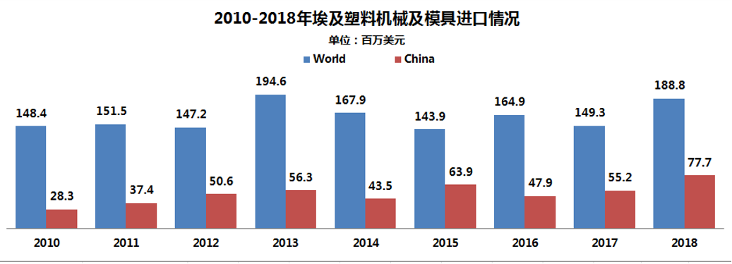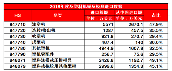 2018年埃及塑料機械的進口規(guī)模達到了1.9億美元。其中“注塑機、擠出機、吹塑機及塑料模具”都是當?shù)刂饕M口的設(shè)備類型(進口額>1400萬美元)。尤其是對注塑機的進口規(guī)模增幅明顯,2018年進口額達5571萬美元,同比上一 年增長35%。中國是埃及塑料機械及模具的最大進口來源國,2018年自中國進口額達7768.7 萬美元,同比增長40%目前中國各類塑料機械和模具在埃及都已經(jīng)擁有了較大的市場占有率。毋庸置疑, 對于中國企業(yè)而言,埃及塑料加工業(yè)是一個真正的黃金市場!