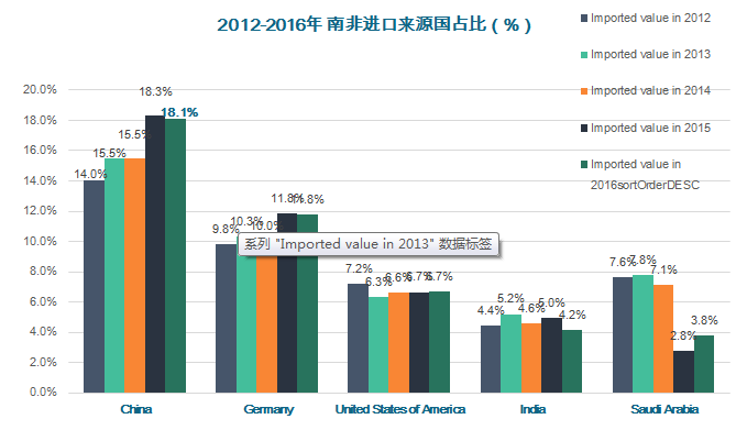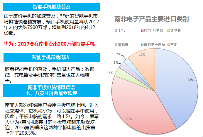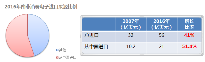2016年南非進口約56億美元的消費電子產(chǎn)品,其中21億來自中國,中國是其最大的消費電子產(chǎn)品進口來源國。