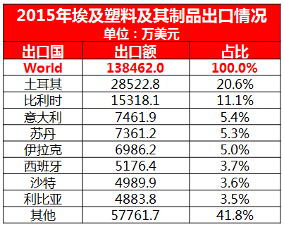 3、除了滿足國內(nèi)市場的塑料需求外,埃及每年也出口大量的塑料制品至非洲和中東其他國家,2015年的出口額高達13.85億美元,出要出口市場為土耳其和意大利。