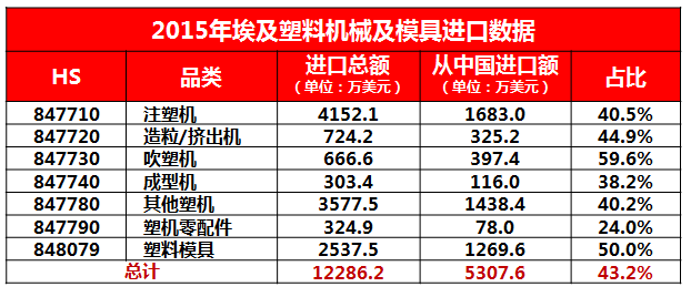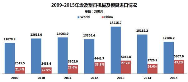 2015年,埃及的塑料機械及模具進口額達到1.23億美元,其中自中國進口的設備規(guī)模達到5307.6萬美元,市場份額超過四成。